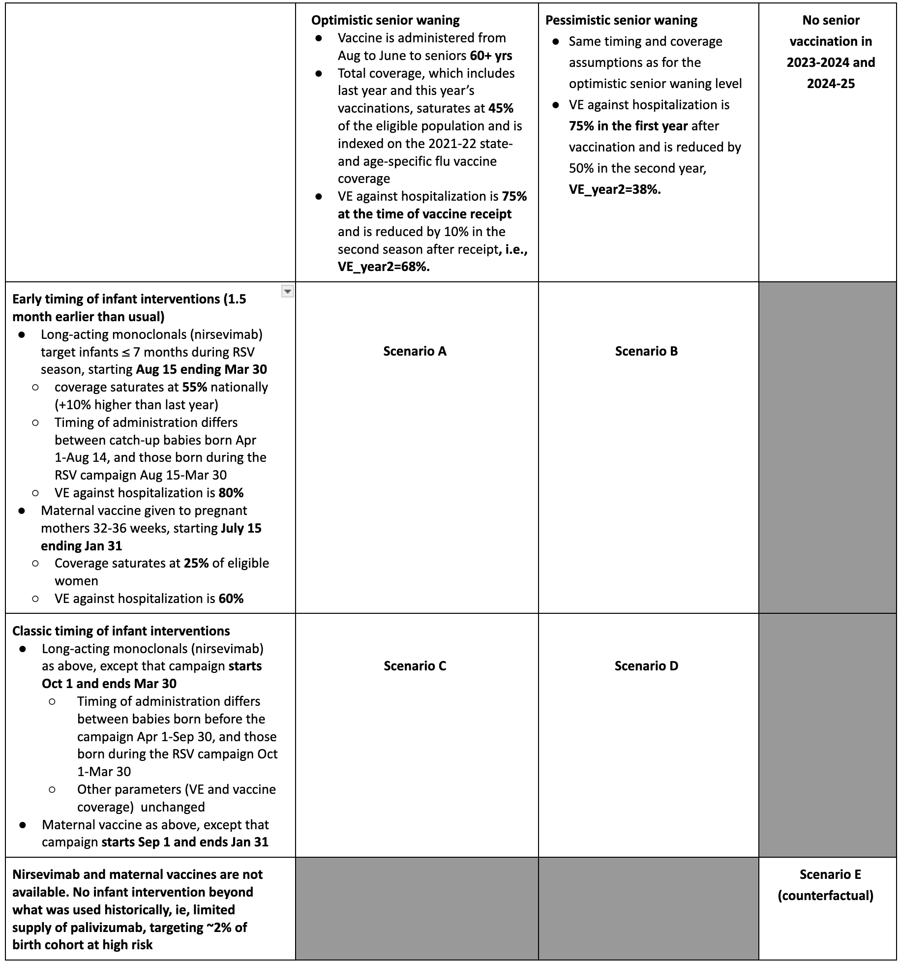 Table 1. RSV Scenario Modeling Hub round 1 2024-2025 scenarios. More detailed scenario definitions and model characteristics can be found at https://github.com/midas-network/rsv-scenario-modeling-hub.