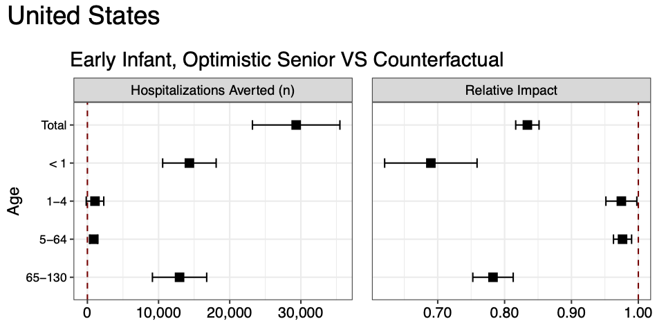 Figure 1. Hospitalizations averted by the most optimistic RSV intervention scenario, as compared to without new RSV vaccines and monocolonal antibodies, across the United States during the 2024-25 season. Infant nirsevimab monoclonals and maternal vaccination are expected to avert 14,300 (95% PI: 10,600-18,100) infant hospitalizations in the early scenario as compared to the status quo, and senior vaccination is expected to avert 13,000 (95% CI: 9,100-16,800) senior hospitalizations in the optimistic waning scenario